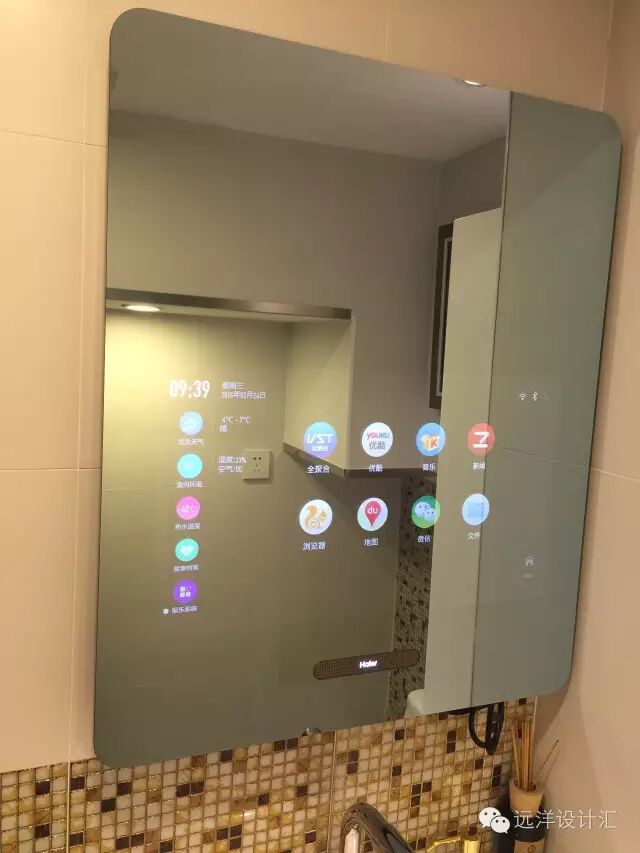 在我們刷牙的的同時,衛浴間內的鏡面顯示器會顯示當天的溫度、空氣品質、24小時內的重點新聞。地面體感設備擁有BMIBody Mass Index, 身體品質指數)檢測功能,在對BMI進行分析後,會提供飲食指導,告訴我們當天的飲食搭配。當我們刷牙結束時,我們就可以查看我們排泄物的檢測結果,系統會對不良結果給予及時的提醒,並推送相關醫療的預約服務。