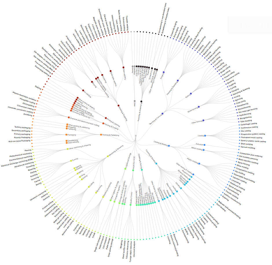 每個部分都有幾個子類別。例如,在「加工和剪切」部分下,有機器照料和裝載機器人、銑削機器人、鑽孔機器人等子部分。